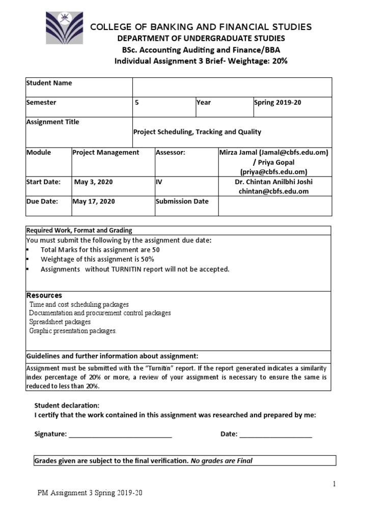Module Project Management Assessor: Mirza Jamal (Jamal@cbfs.edu.om)