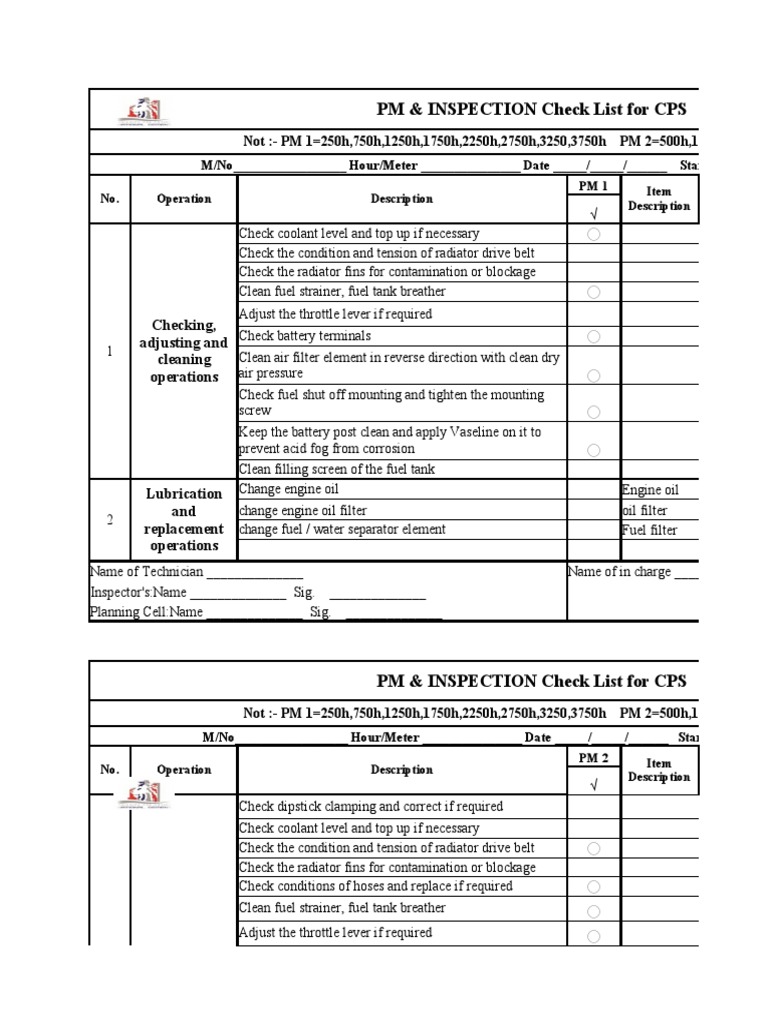 PM & INSPECTION Check List for CPS