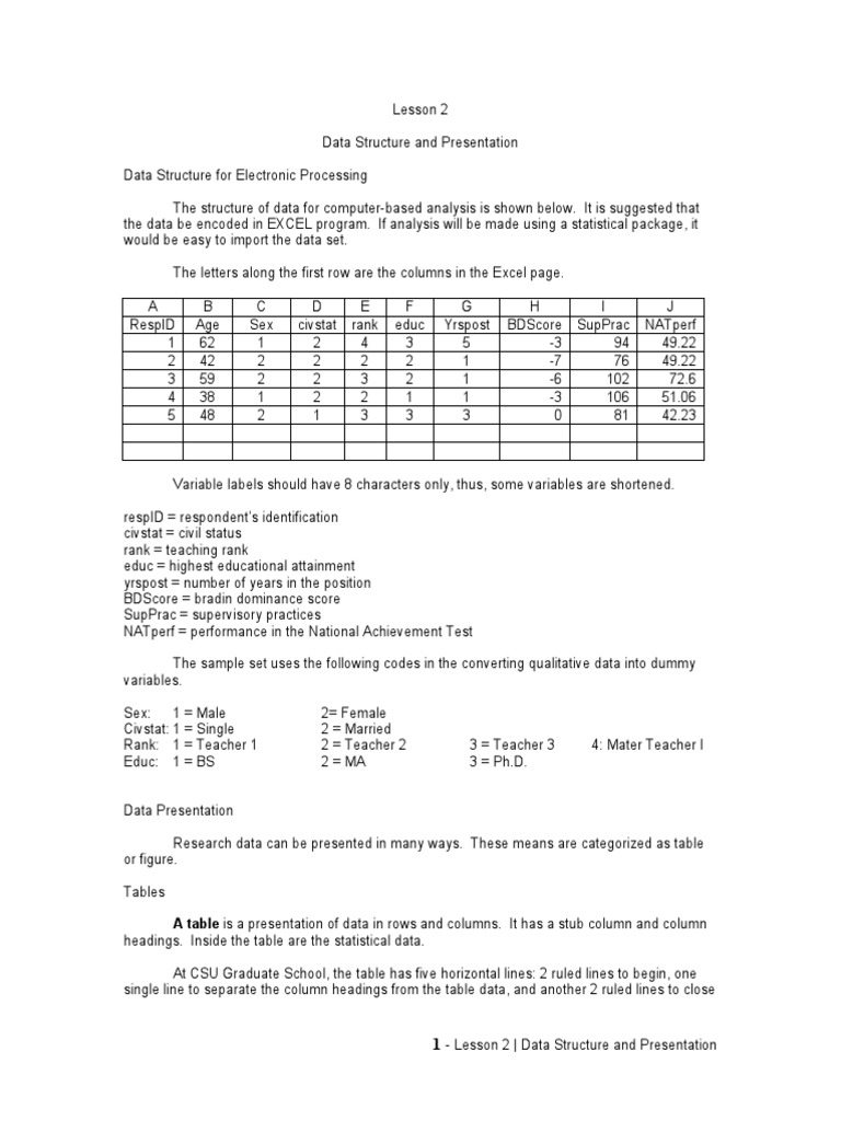 The structure of data for computer-based analysis is shown below. It is suggested that