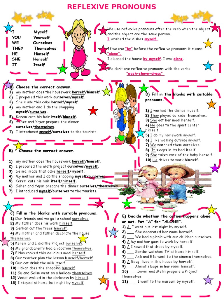 5) Kerem and I did the Project ourselves. 4) A My mother goes to work by herself.