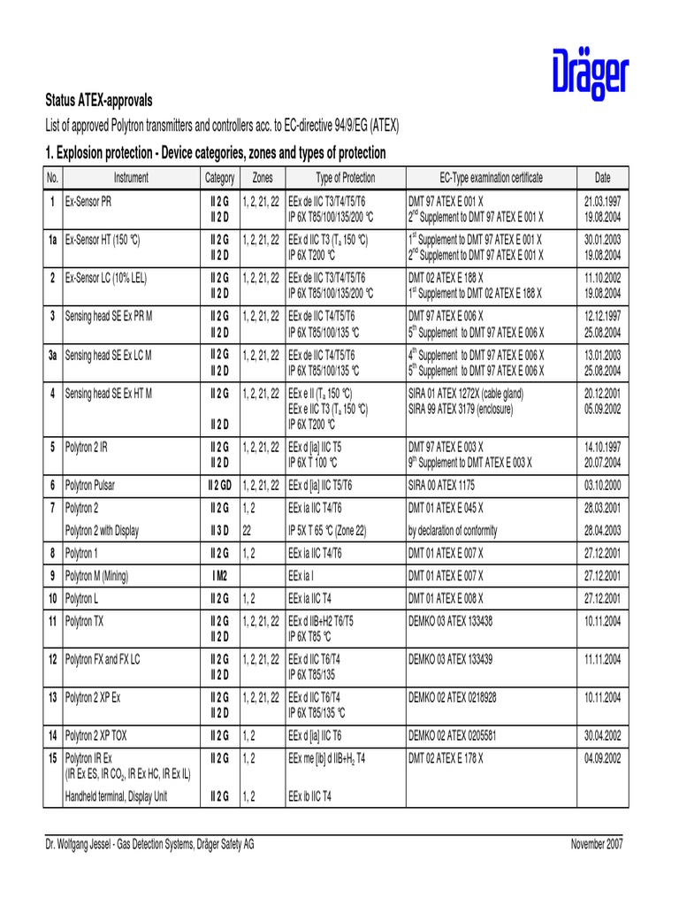List of approved Polytron transmitters and controllers acc. to EC-directive 94/9/EG (ATEX)