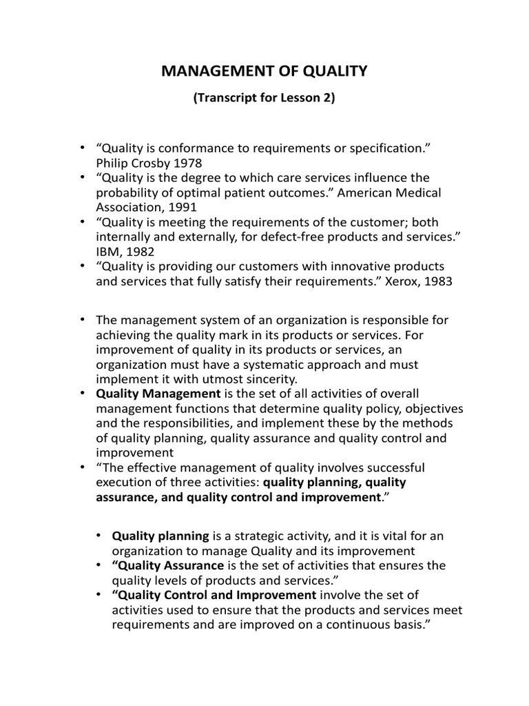 MANAGEMENT OF QUALITY