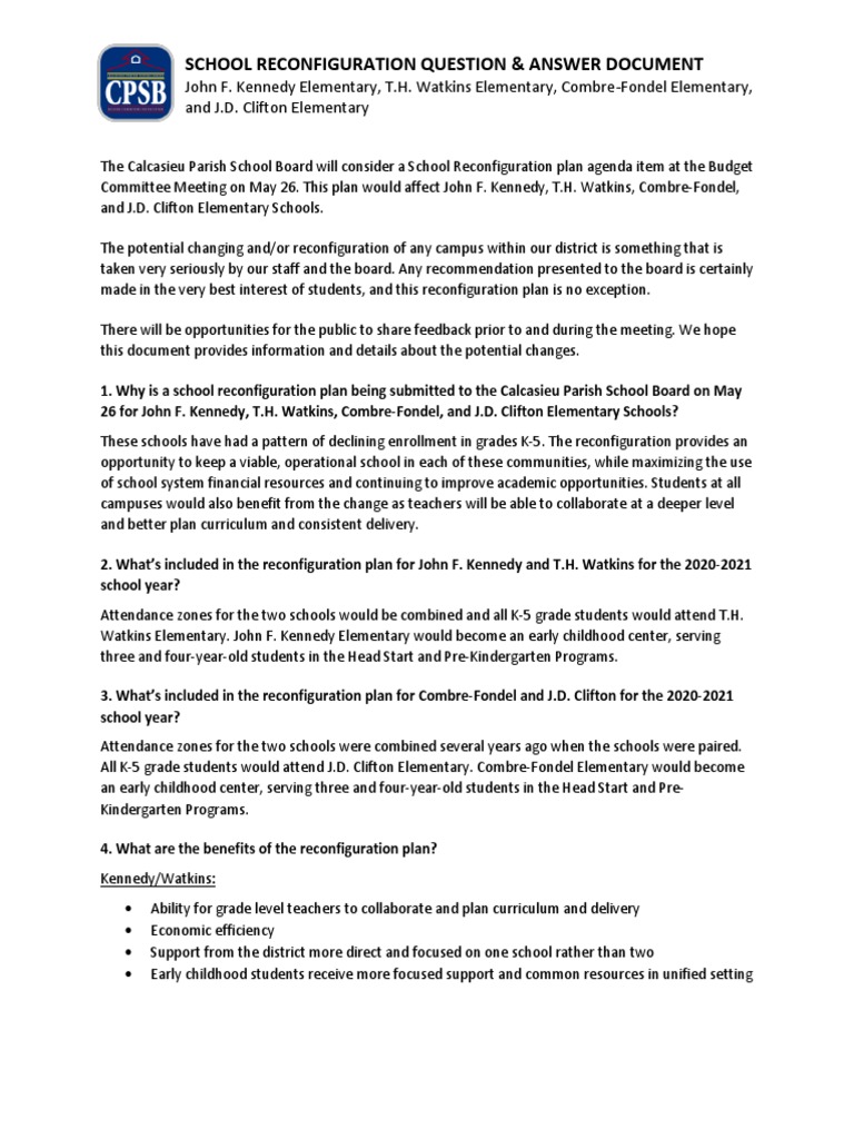 1. Why is a school reconfiguration plan being submitted to the Calcasieu Parish School Board on May