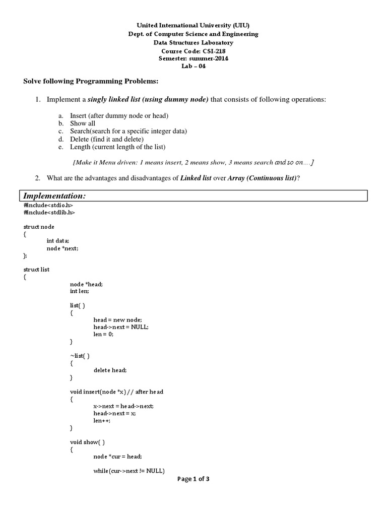1. Implement a singly linked list (using dummy node) that consists of following operations: