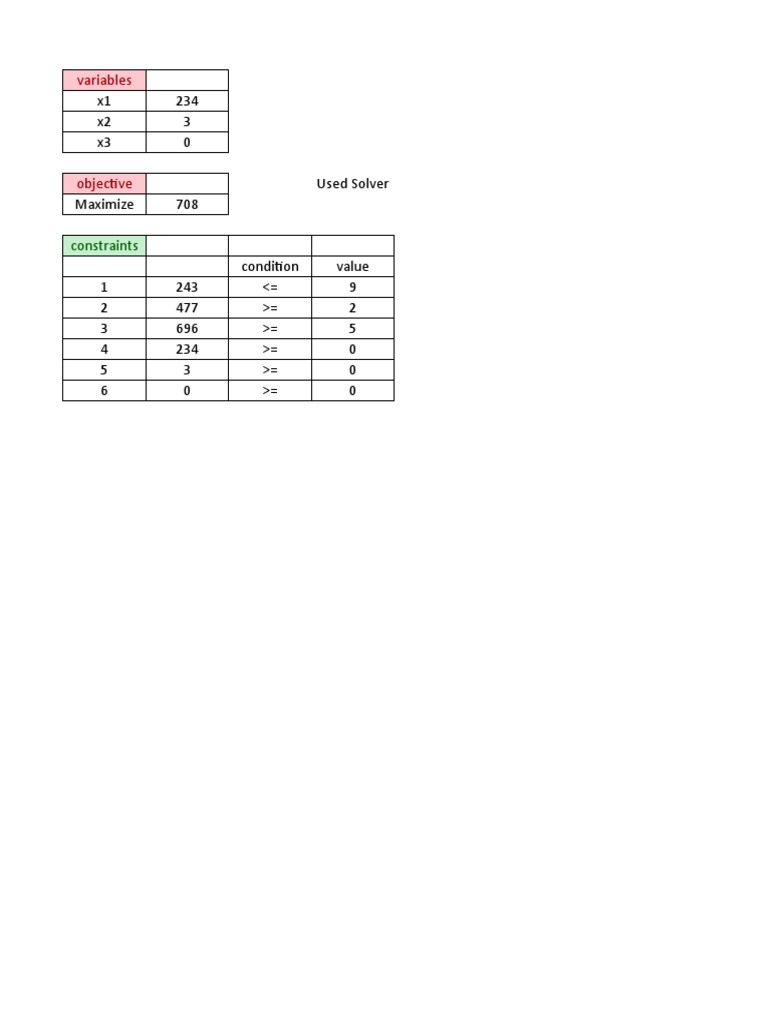 This document contains variables x1-x3 with values 234, 3, and 0, respectively. The objective is to maximize 708 subject to 6 constraints where variables and values must be less than or greater than specified amounts.