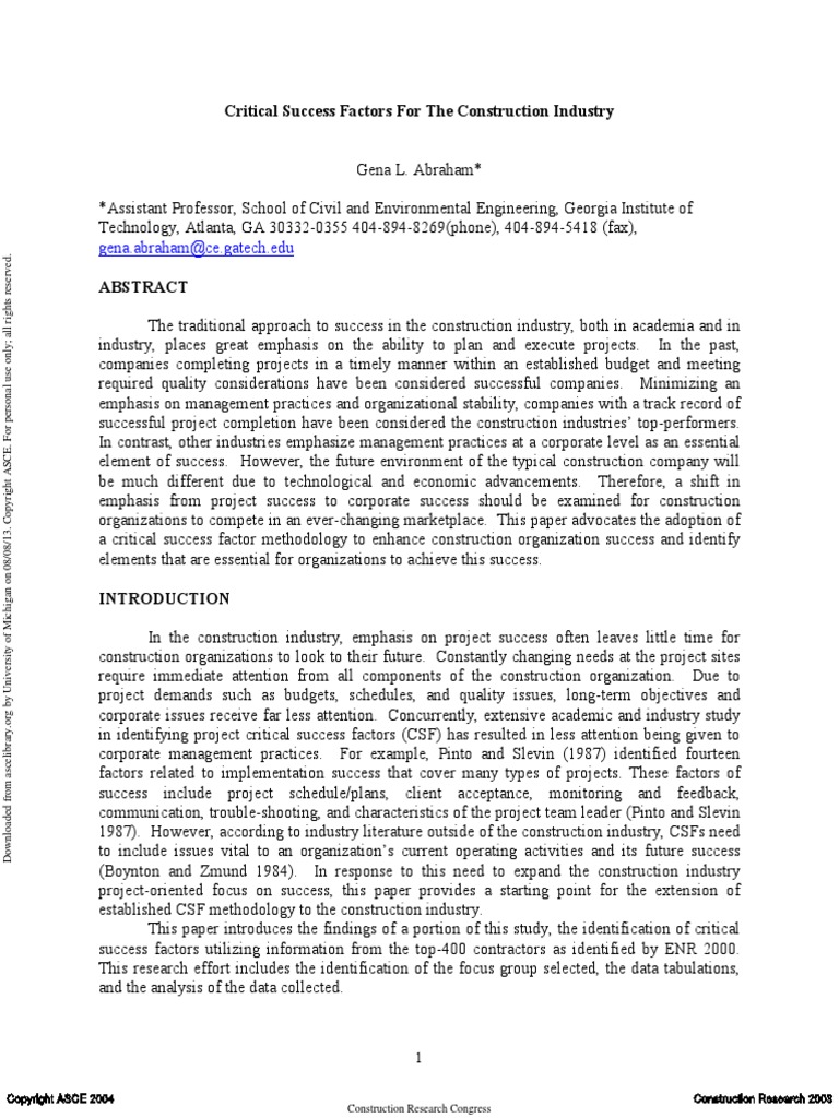 Critical Success Factors For The Construction Industry: Gena - Abraham@ce - Gatech.edu