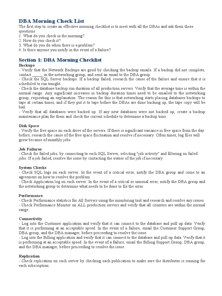 The first step to create an effective morning checklist is to meet with all the DBAs and ask them these