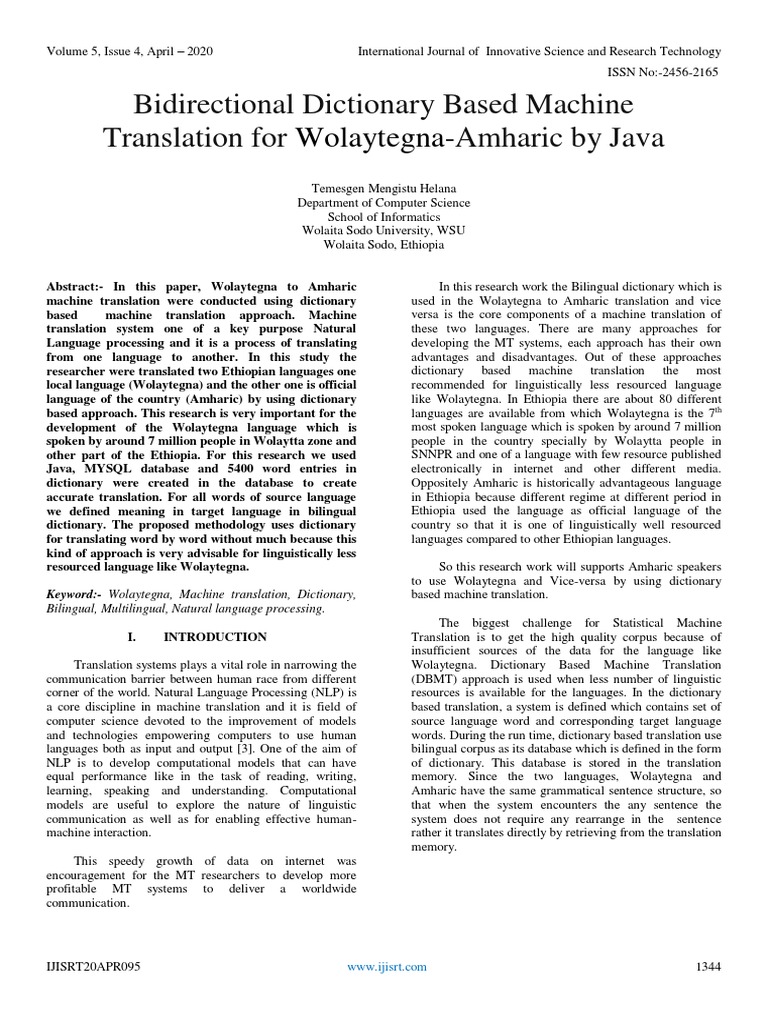 Keyword:- Wolaytegna, Machine translation, Dictionary, based machine translation.