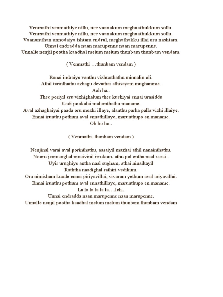 Venmathi venmathiye nillu, nee vaanakum meghaathukkum sollu.