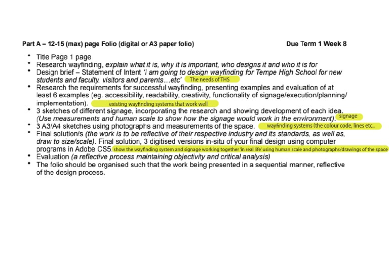 The document discusses improving the wayfinding systems and signage at THS. It suggests keeping existing wayfinding elements that work well, such as color codes and lines, while also updating signage. Visual examples should be provided to demonstrate how the wayfinding system and signage will function together in real spaces using human perspectives and photos/drawings.