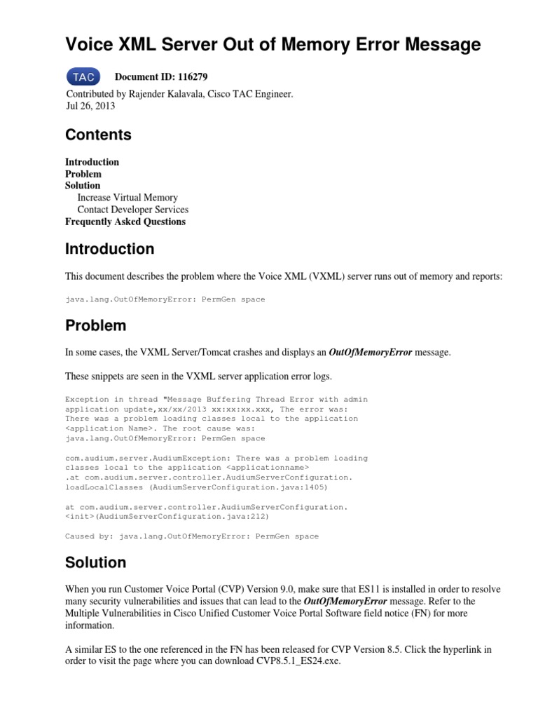 This document describes the problem where the Voice XML (VXML) server runs out of memory and reports: