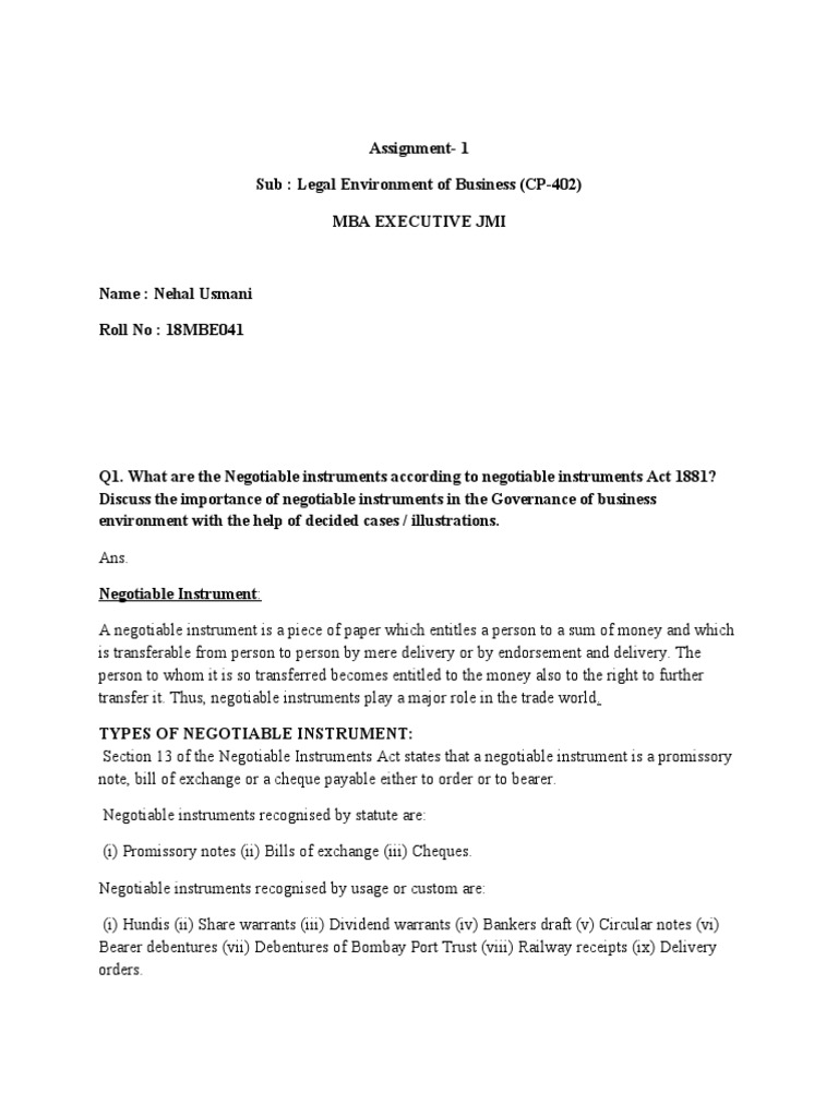 Q1. What are the Negotiable instruments according to negotiable instruments Act 1881?