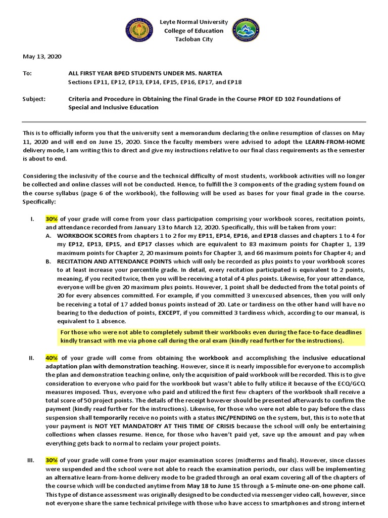 Subject: Criteria and Procedure in Obtaining the Final Grade in the Course PROF ED 102 Foundations of