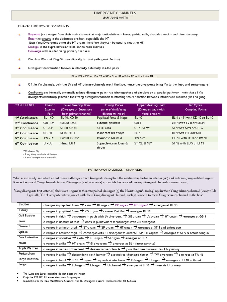 Typically, Yin divergents enter (1) meet with their Yang divergent channel, and (2) connect to their Yang primary channel in the head