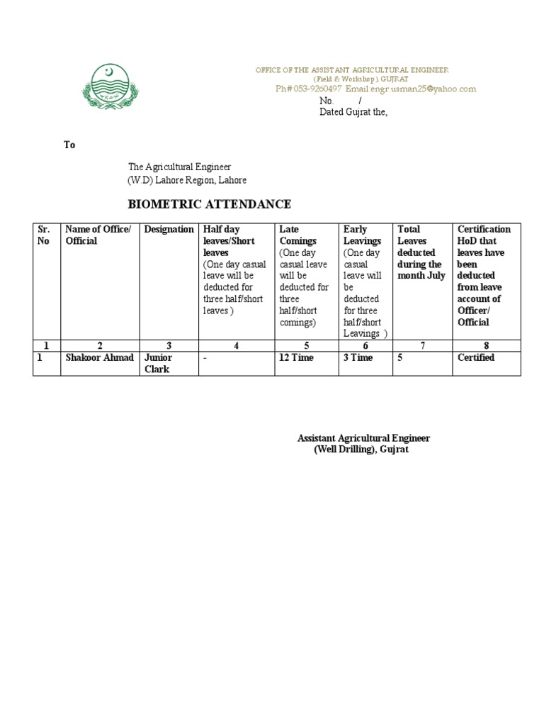 Sr. Name of Office/ Designation Half day Late Early Total Certification