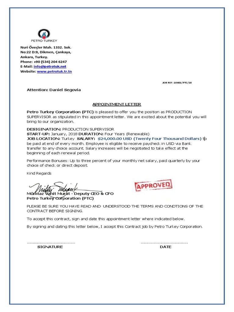By signing and dating this letter below, I accept this Contract job by Petro Turkey Corporation.