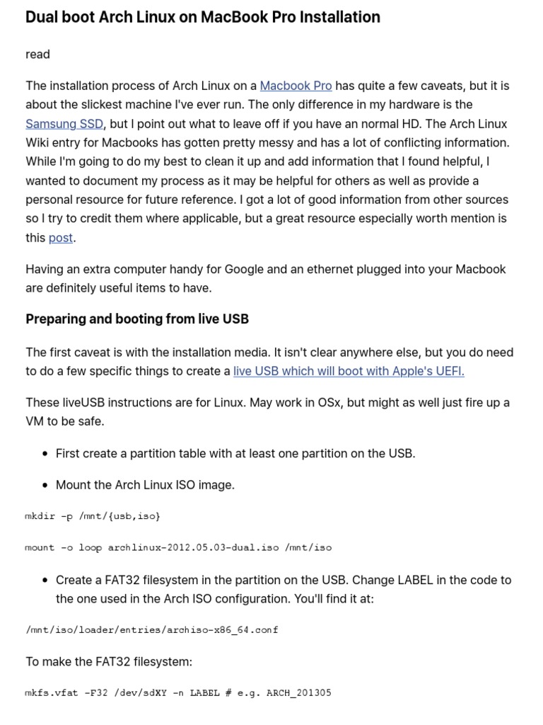 The installation process of Arch Linux on a Macbook Pro has quite a few caveats, but it is