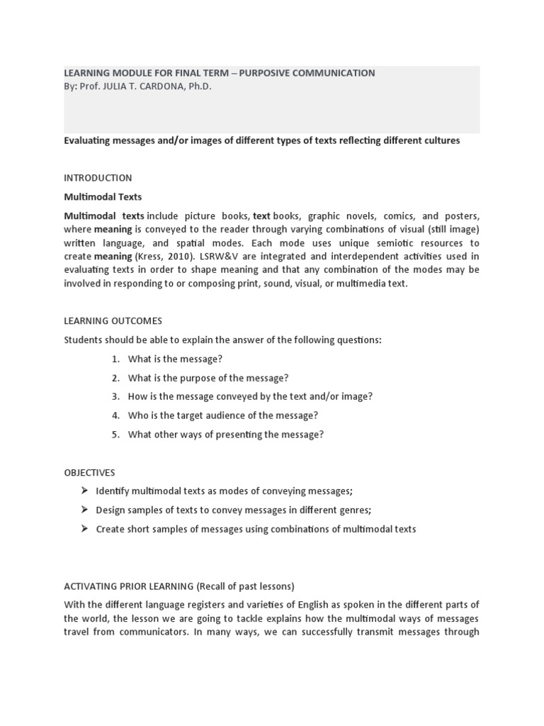 LEARNING MODULE FOR FINAL TERM – PURPOSIVE COMMUNICATION