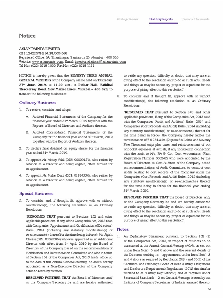27th June, 2019, at 11.00 a.m. at Patkar Hall, Nathibai and things as may be necessary, proper or expedient for the