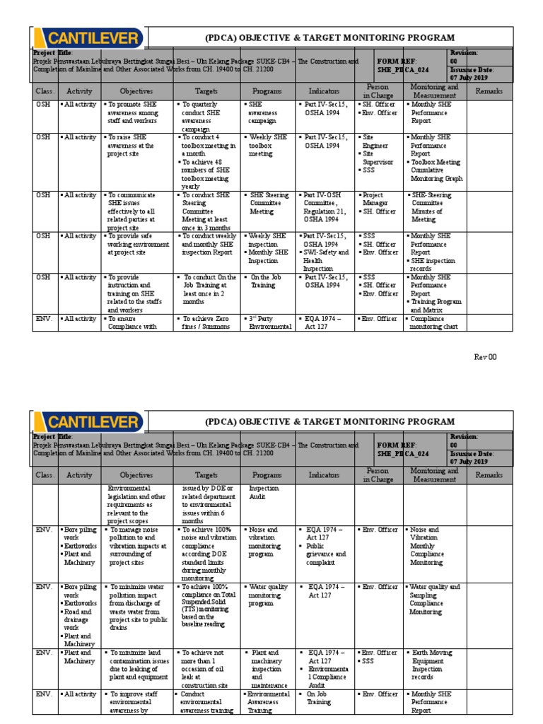 (PDCA) OBJECTIVE & TARGET MONITORING PROGRAM