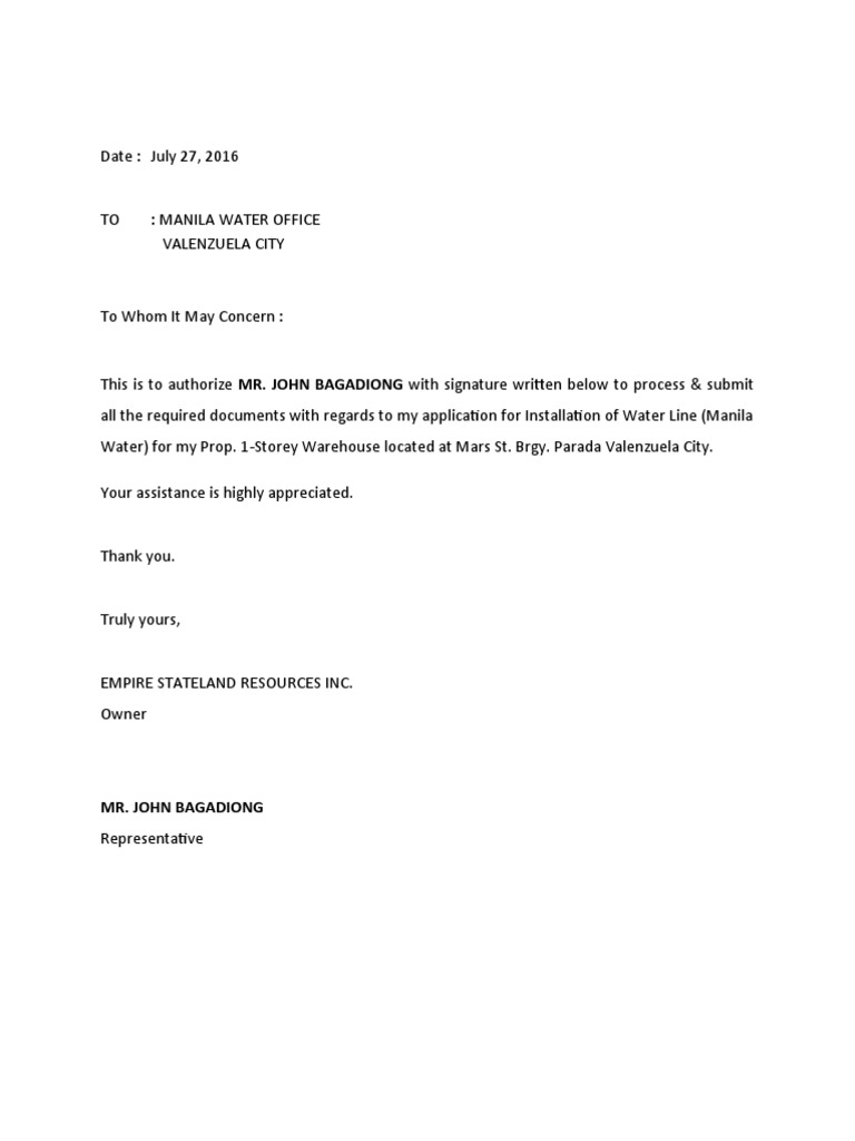 all the required documents with regards to my application for Installation of Water Line (Manila