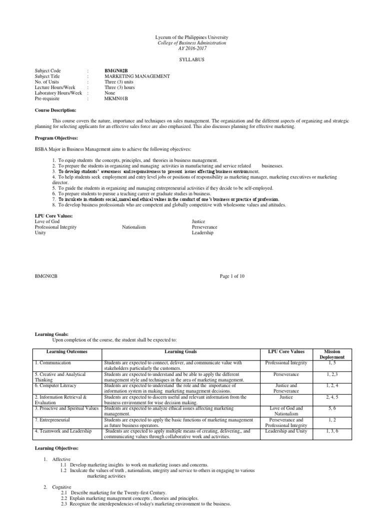 3. Proactive and Spiritual Values Students are expected to analyze ethical issues affecting marketing Love of God and 5, 6