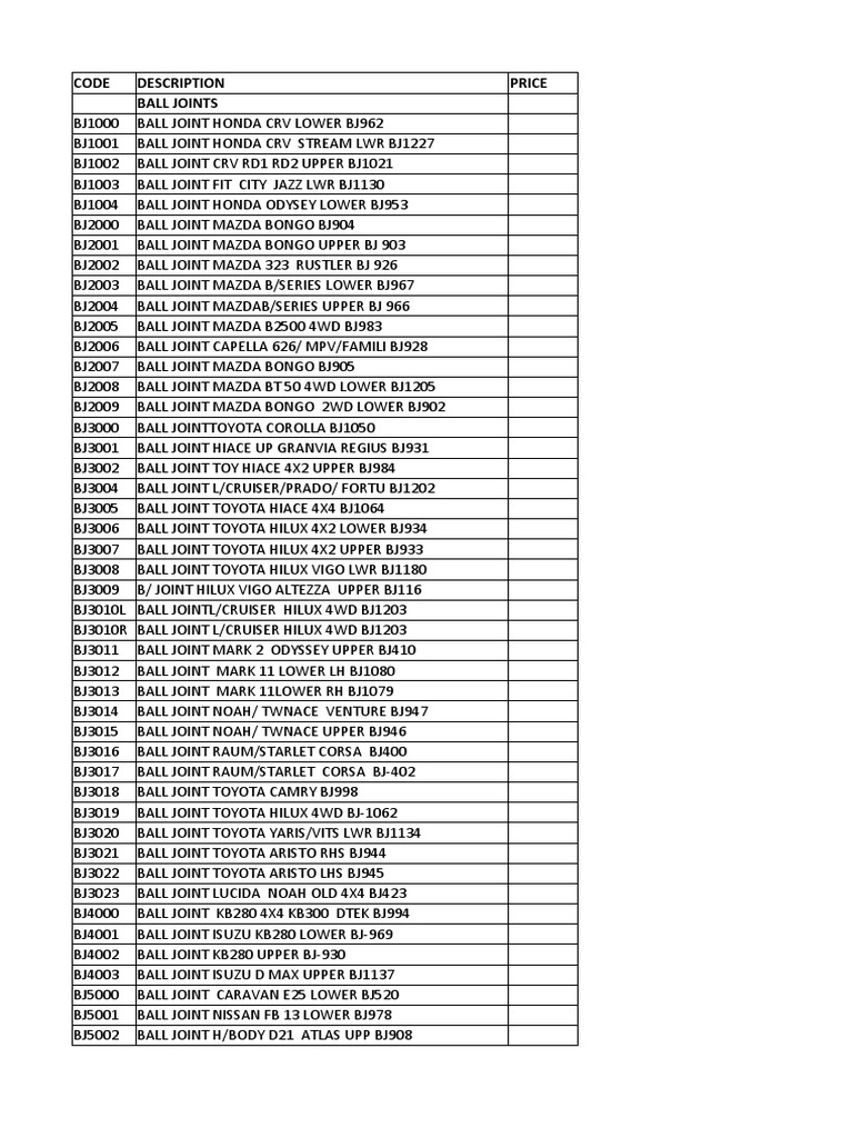 BJ3000 BALL JOINTTOYOTA COROLLA BJ1050