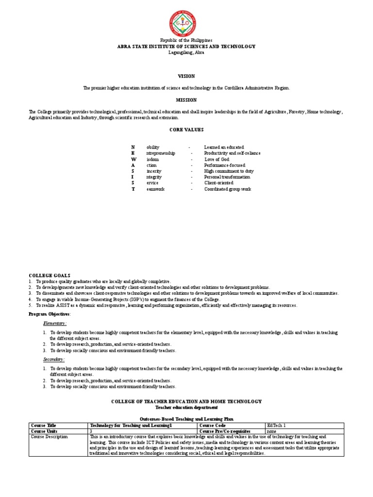 Course Title Technology for Teaching and Learning1 Course Code EdTech 1