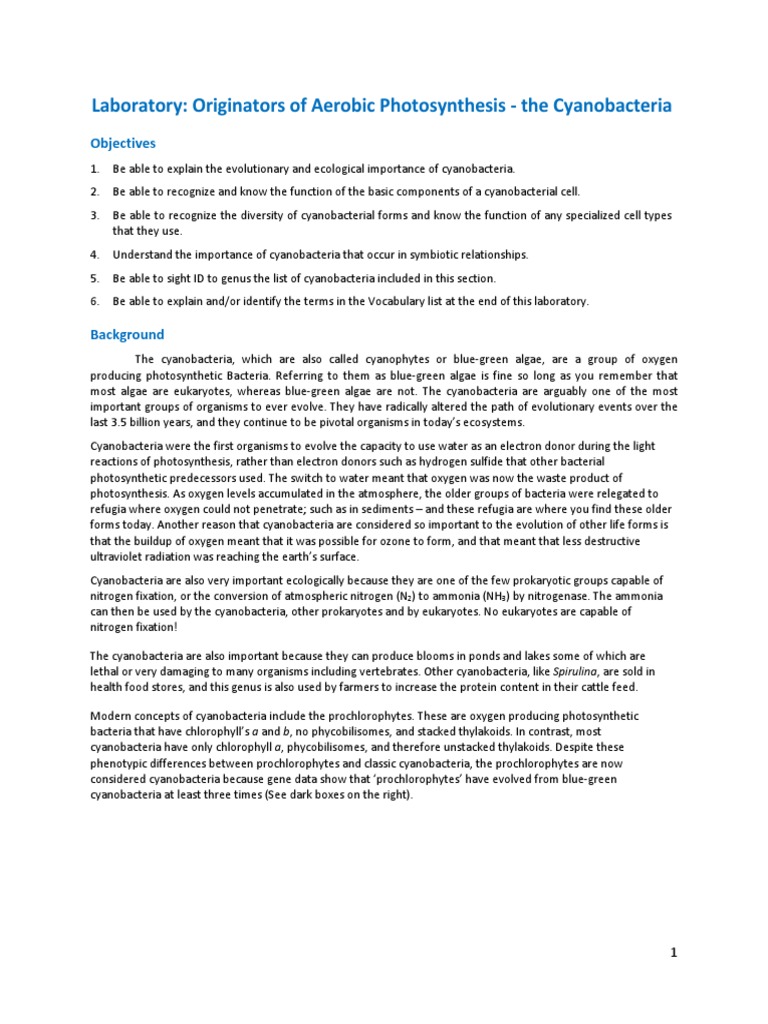 Laboratory: Originators of Aerobic Photosynthesis ‐ the Cyanobacteria