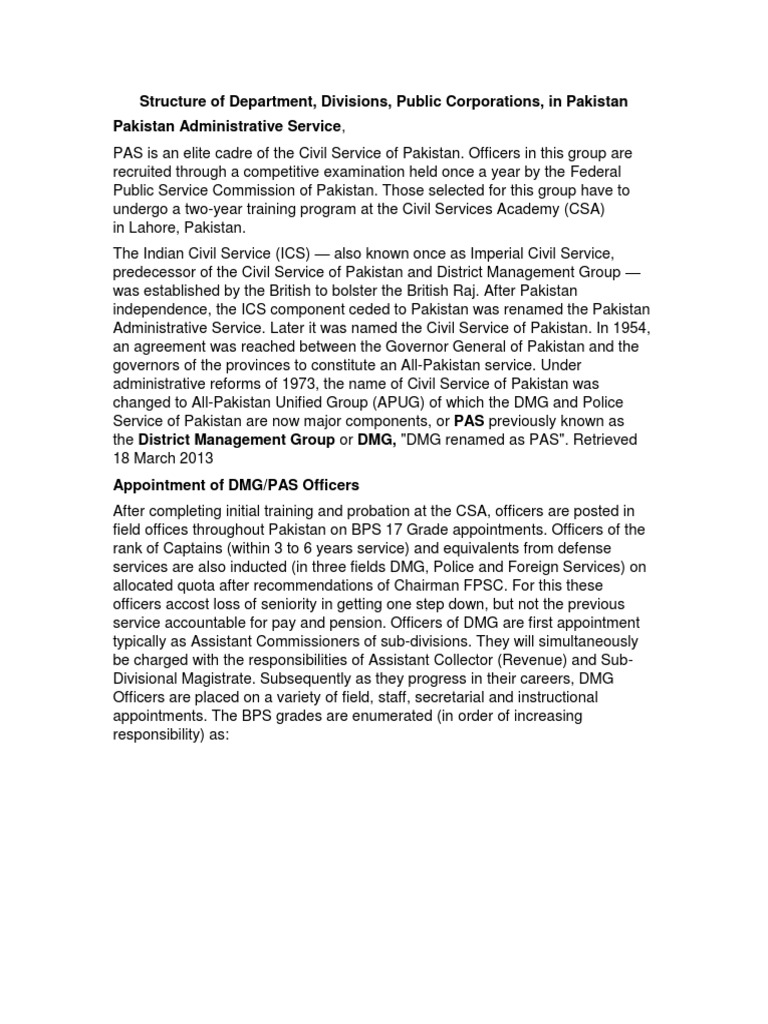 Structure of Department, Divisions, Public Corporations, in Pakistan