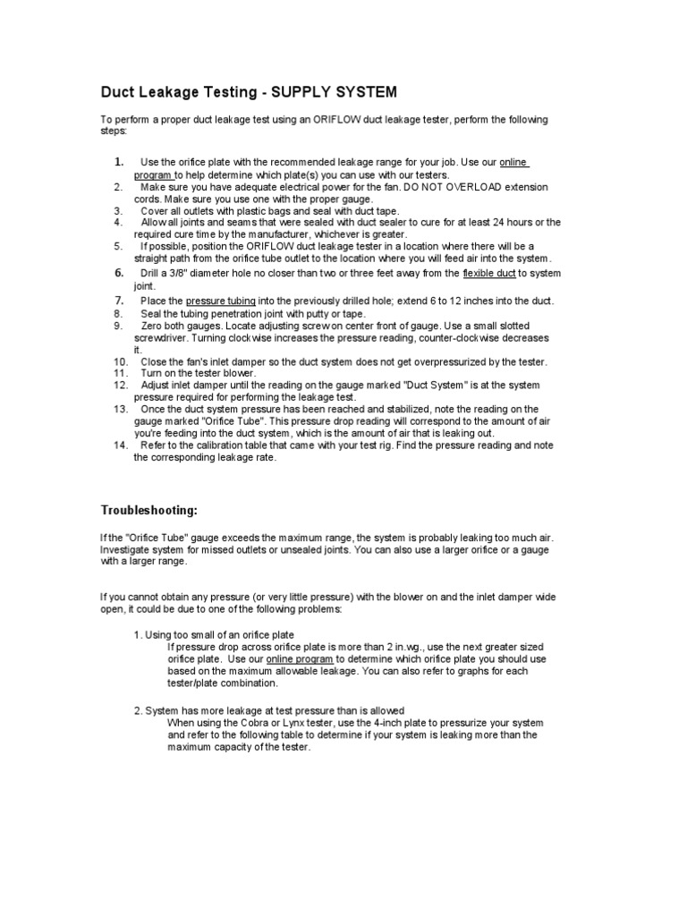 To perform a proper duct leakage test using an ORIFLOW duct leakage tester, perform the following