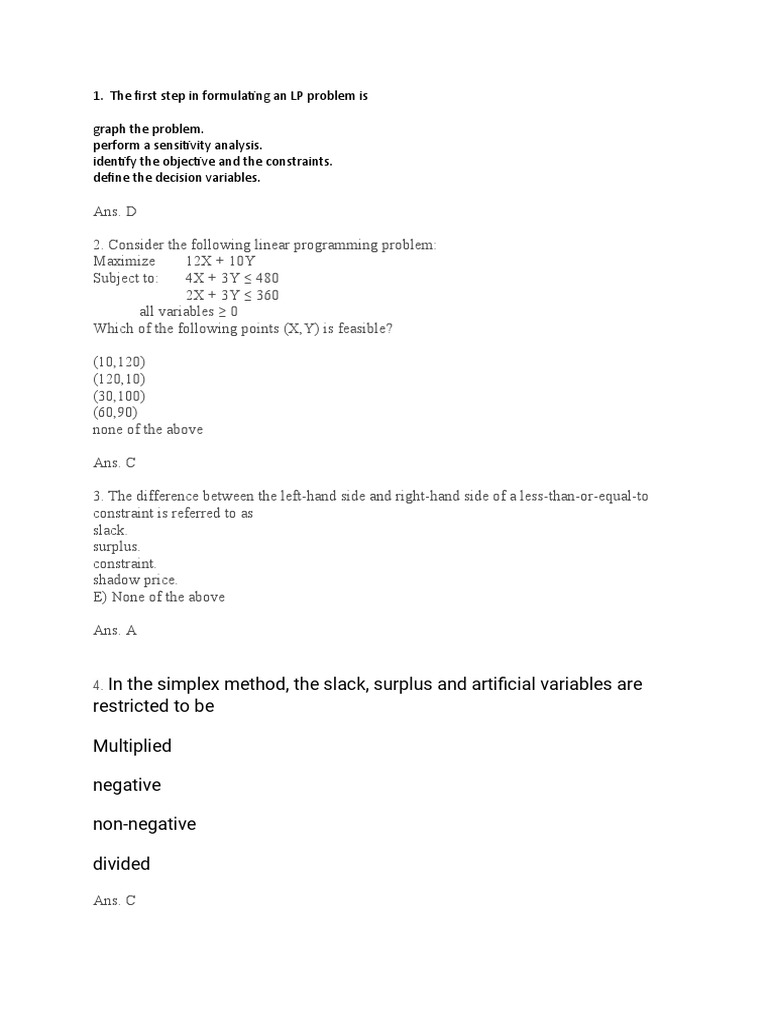 4. Inthe simplex method, the slack, surplus and artificial variables are