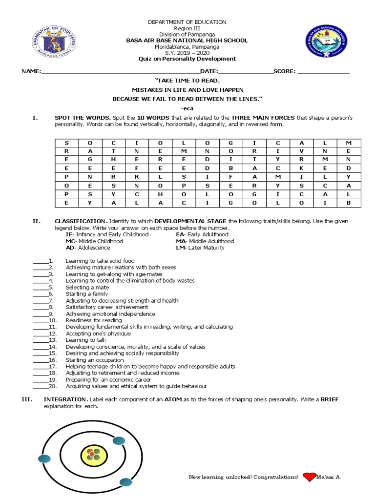 III. INTEGRATION. Label each component of an ATOM as to the forces of shaping one’s personality. Write a BRIEF