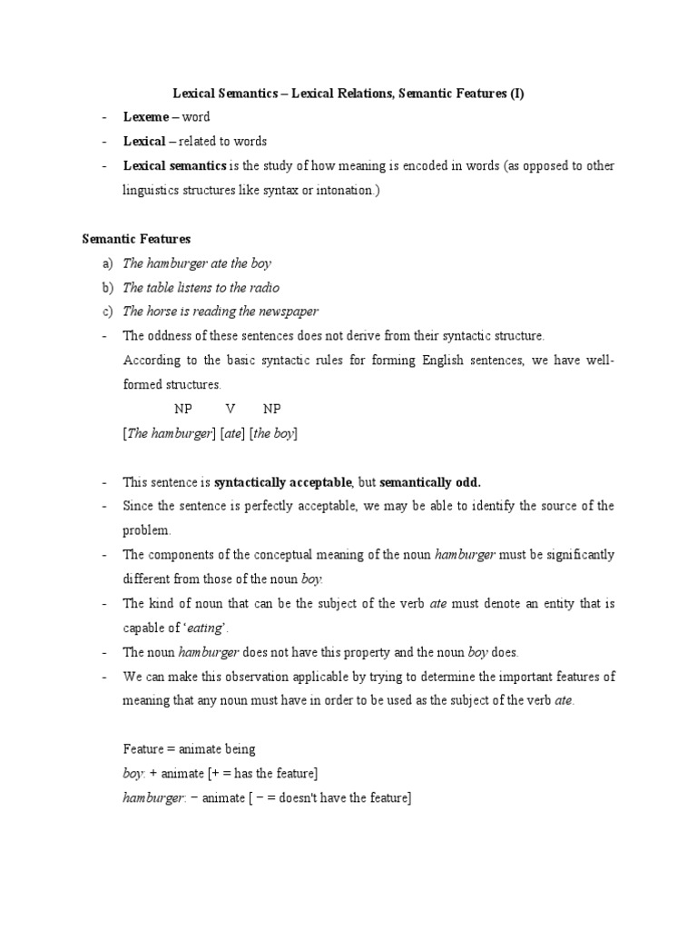 Lexical Semantics – Lexical Relations, Semantic Features (I)