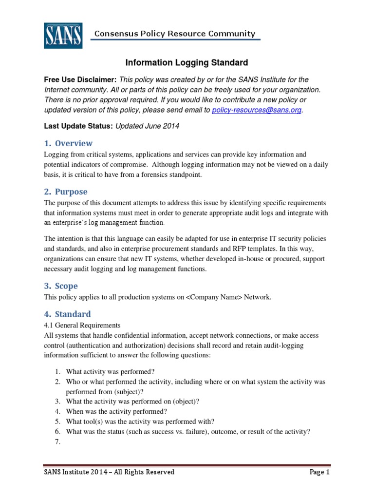 This document provides an information logging standard for critical systems and applications. It requires logging of activities including user authentication, access control changes, software updates, and detected security issues. Logs must include details of the action, user, object, date/time and success/failure. Logs are to be formatted and stored in a way that ensures integrity and enables enterprise-level analysis. Compliance will be measured through audits and exceptions must be approved.