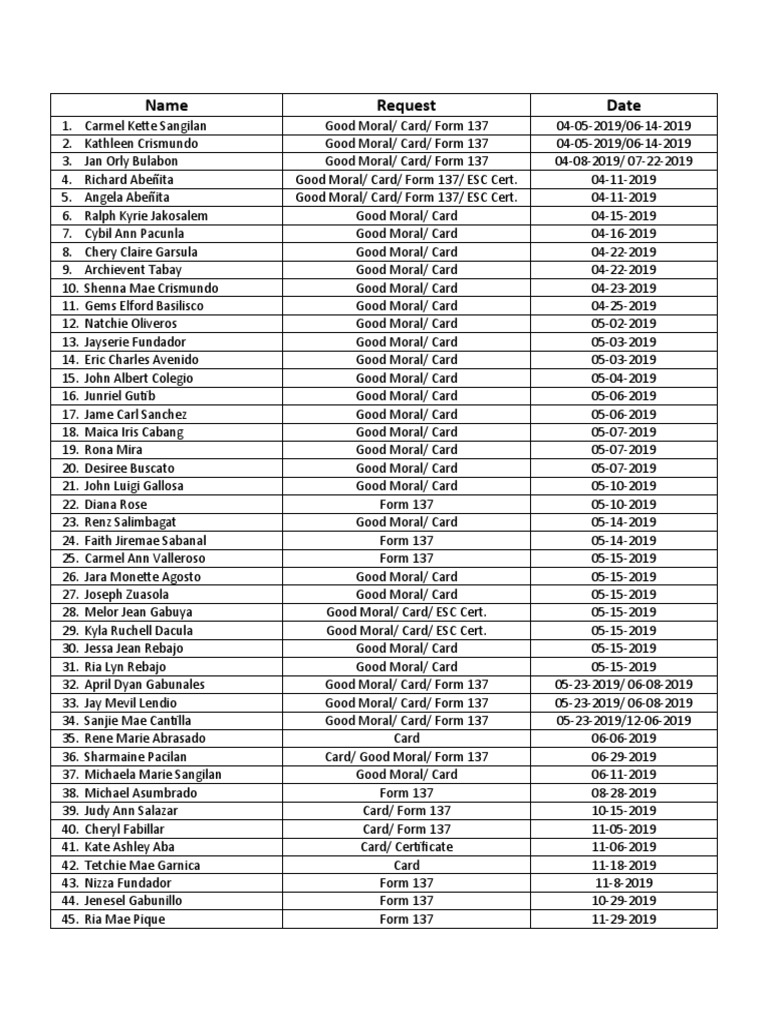 1. Carmel Kette Sangilan Good Moral/ Card/ Form 137 04-05-2019/06-14-2019