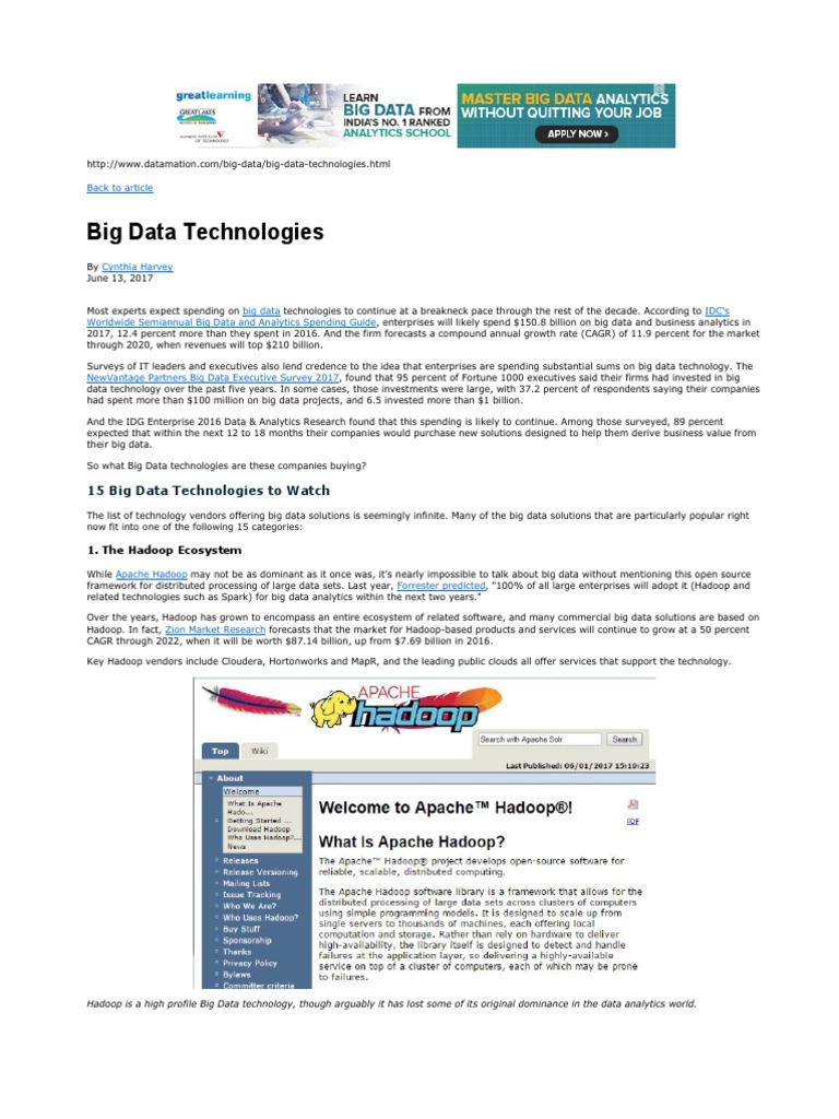 Hadoop is a high profile Big Data technology, though arguably it has lost some of its original dominance in the data analytics world.