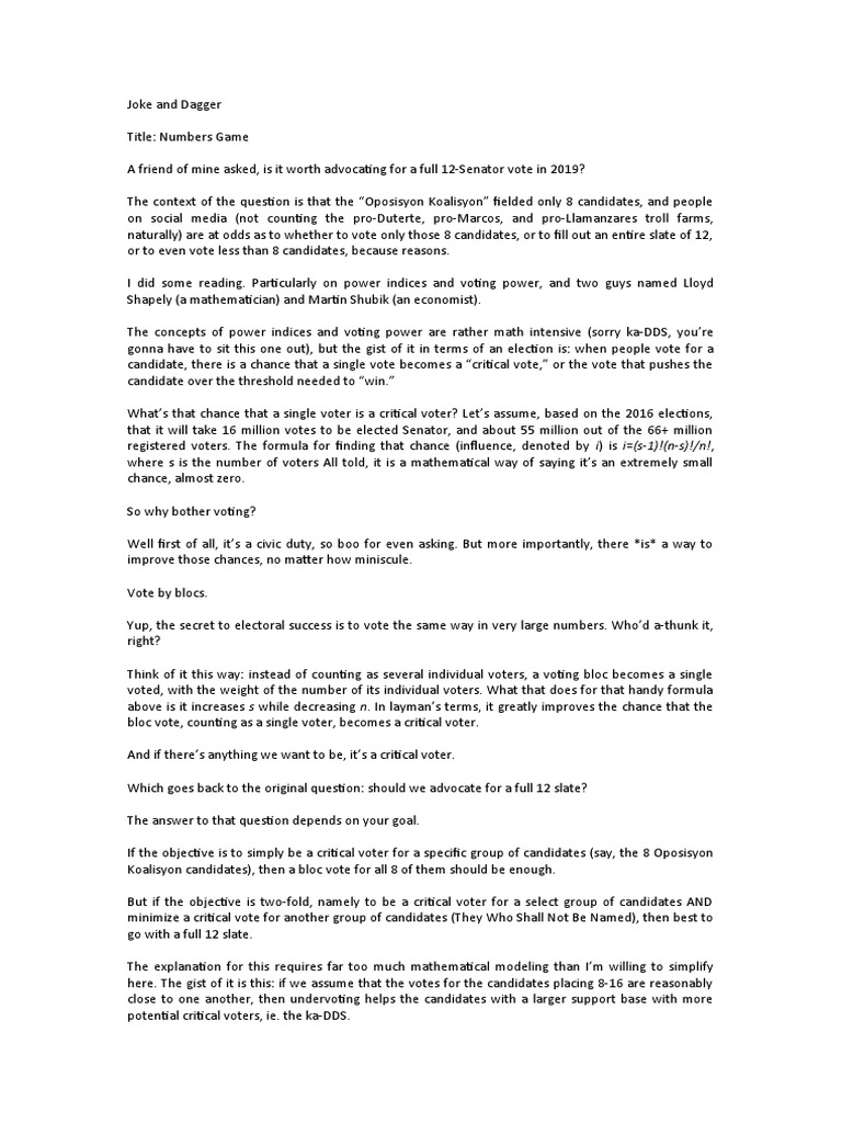 If the objective is to simply be a critical voter for a specific group of candidates (say, the 8 Oposisyon