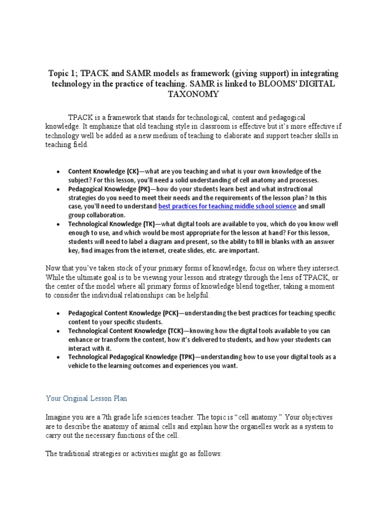 Topic 1; TPACK and SAMR models as framework (giving support) in integrating