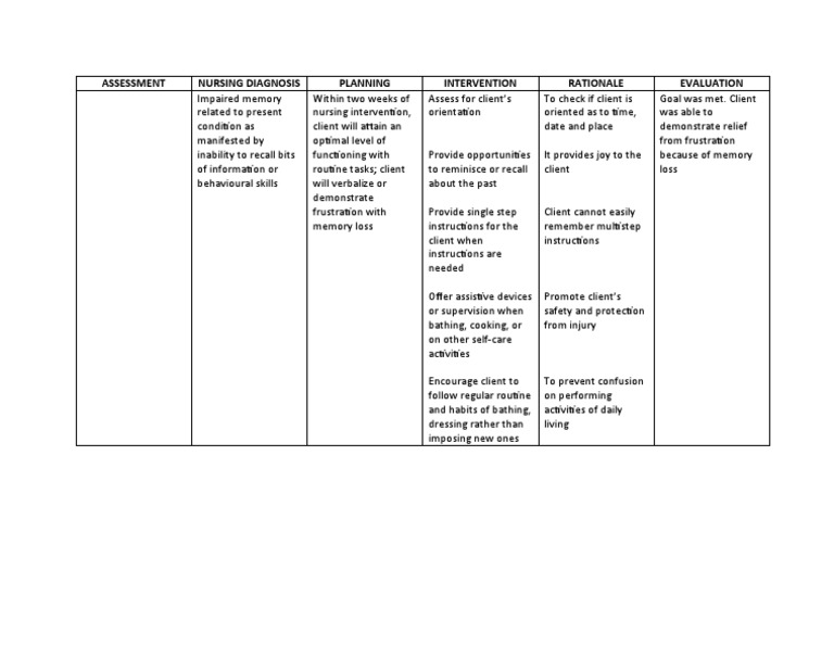 Impaired memory Within two weeks of Assess for client’s To check if client is Goal was met. Client