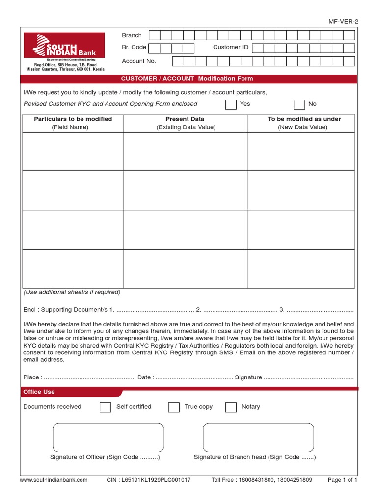 I/We request you to kindly update / modify the following customer / account particulars,