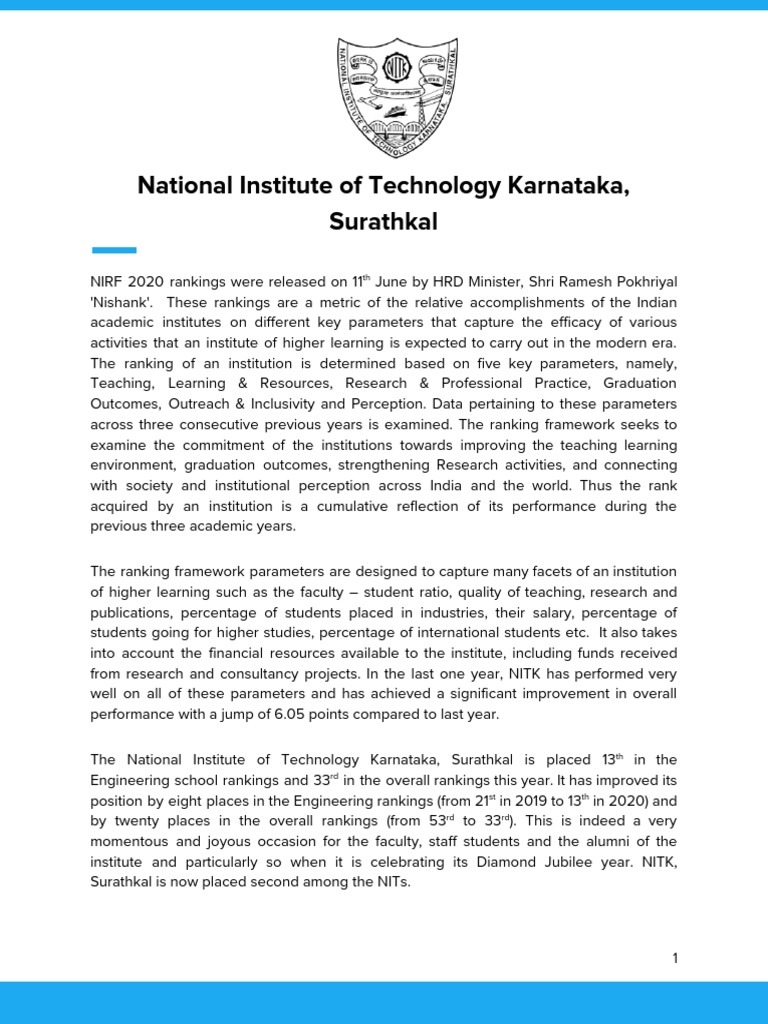 Surathkal is now placed second among the NITs.
