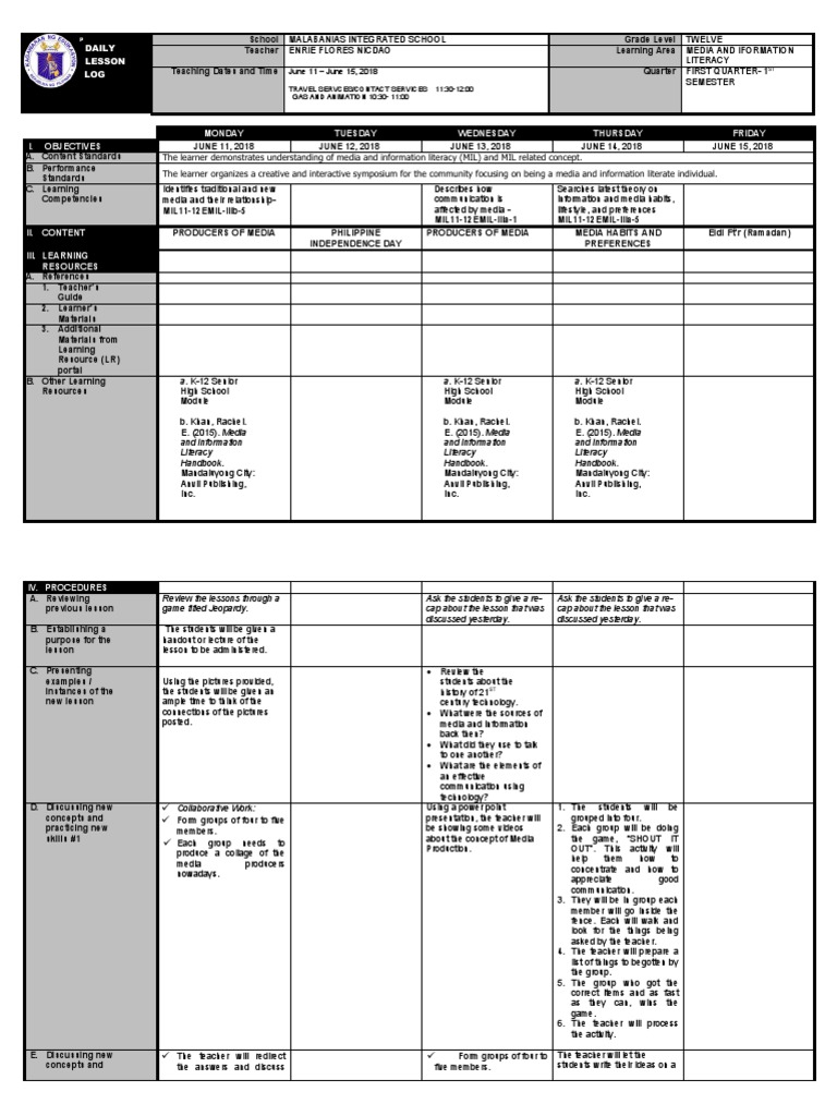 DAILY Teacher ENRIE FLORES NICDAO Learning Area MEDIA AND IFORMATION