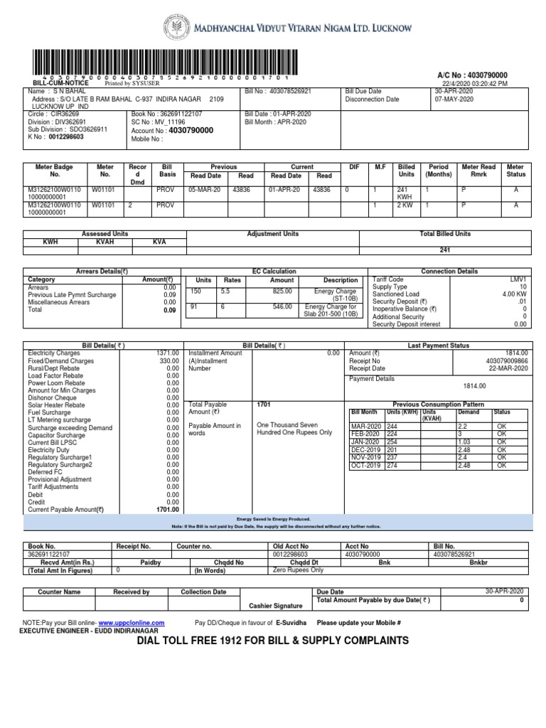 Circle : CIR36269 Book No : 362691122107 Bill Date : 01-APR-2020