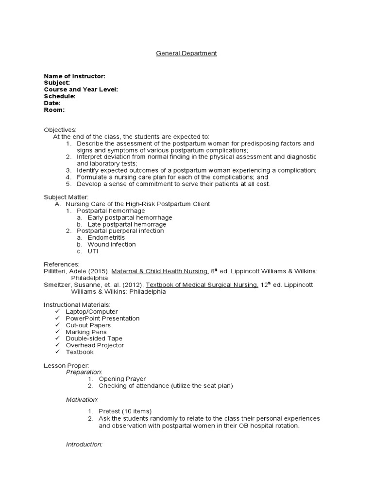 3. Identify expected outcomes of a postpartum woman experiencing a complication;