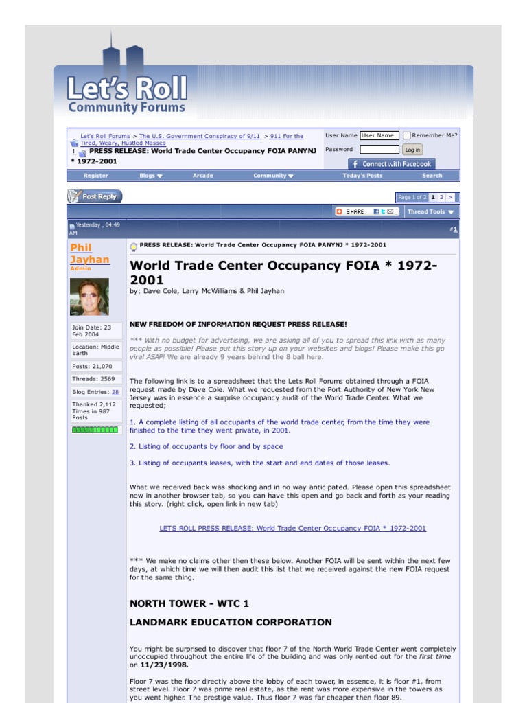 LETS ROLL PRESS RELEASE: World Trade Center Occupancy FOIA * 1972-2001