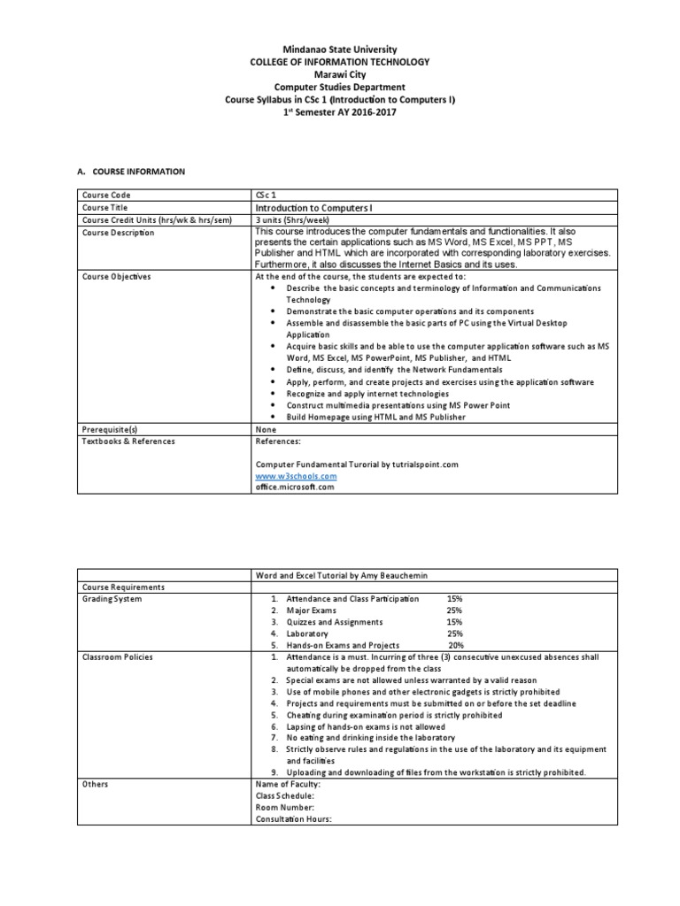 Course Syllabus in CSc 1 (Introduction to Computers I)