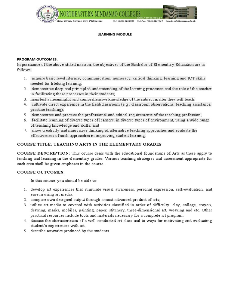 COURSE TITLE: TEACHING ARTS IN THE ELEMENTARY GRADES