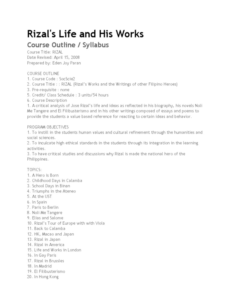 2. Course Title : : RIZAL (Rizal’s Works and the Writings of other Filipino Heroes)