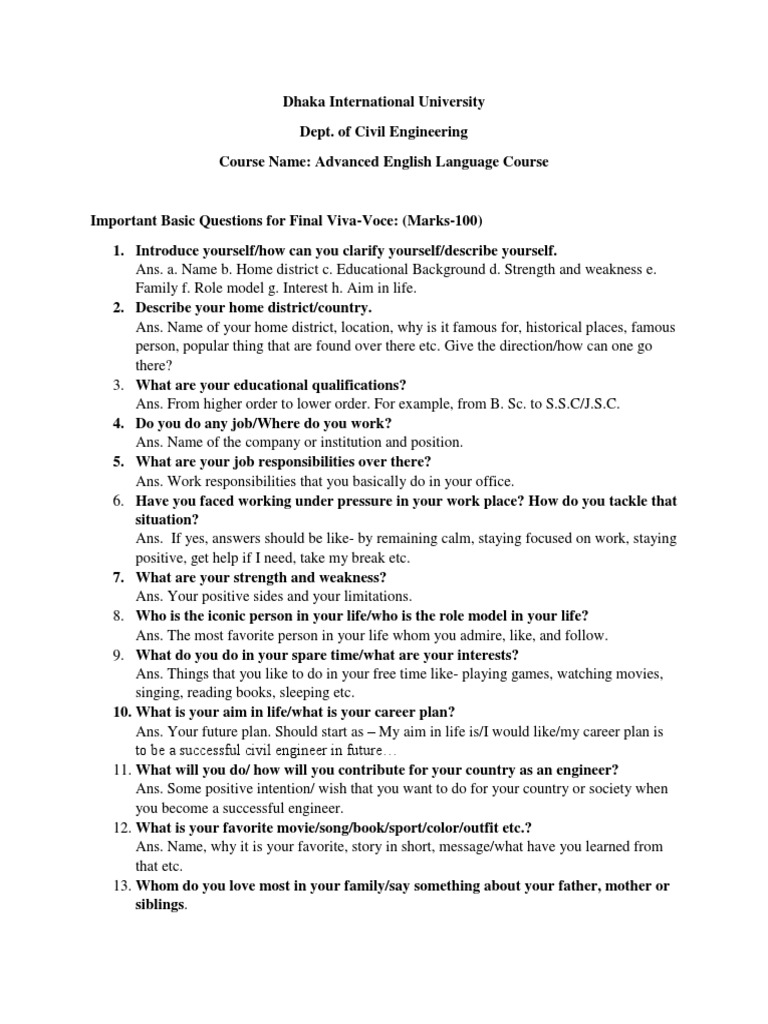 Important Basic Questions for Final Viva-Voce: (Marks-100)